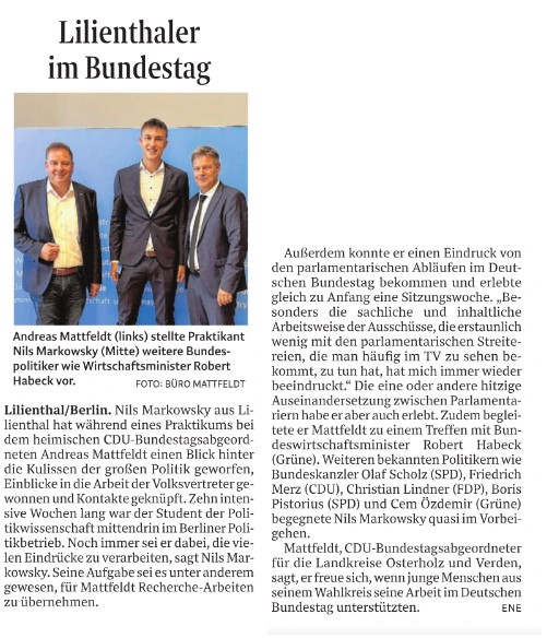 Einblick in die Politik Lilienthaler im Bundestag Irene Niehaus Lilienthal/Berlin. Nils Markowsky aus Lilienthal hat während eines Praktikums bei dem ...