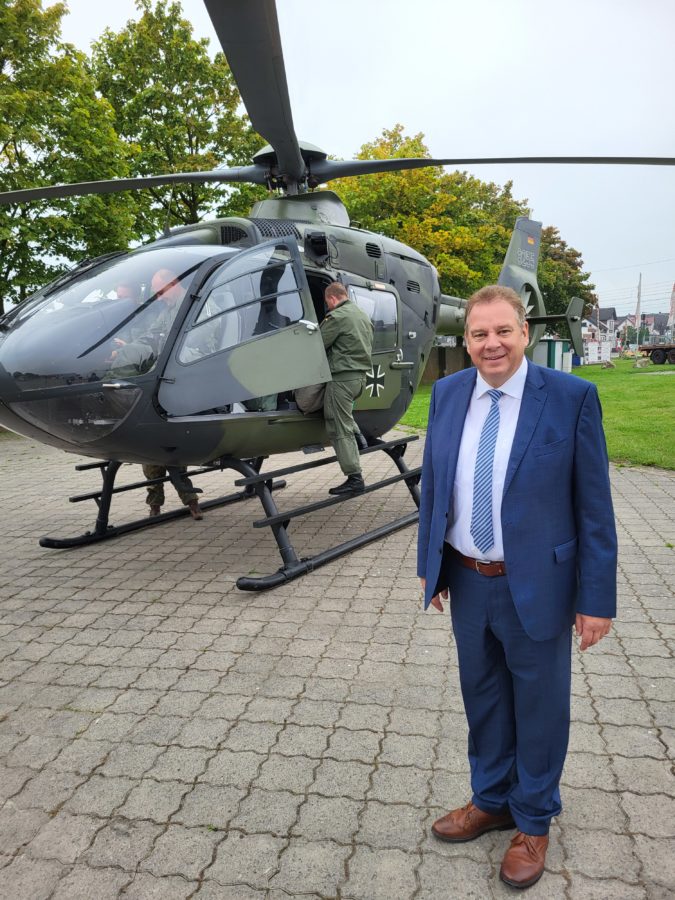 Andreas Mattfeldt vor dem gerade gelandeten Hubschrauber der Bundeswehr aus Bückeburg. Foto: Büro Mattfeldt