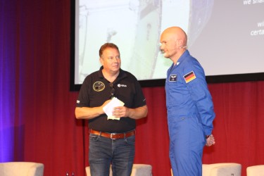 Ein weiterer Höhepunkt war der Auftritt des ISS-Kommandanten Alexander Gerst vor bis auf den letzten Platz gefüllten Rängen. Auch die jüngsten Zuhörer hingen dem Raumfahrer quasi an den Lippen bei seinem sehr spannenden Vortrag über seine beiden Raumfahrtmissionen zur und auf der ISS. „Schaut mal die ist wirklich rund“, erinnerte der Geophysiker sich an seinem ersten Eindruck unseres blauen Heimatplaneten, als er das erste Mal den Orbit in seiner Raumkapsel erreicht hatte. Insgesamt hatte er 364 Tage im All verbracht und konnte so viele wunderschöne Bilder präsentieren, die er selber von der ISS aus aufgenommen hatte. „Die ISS ist die komplexeste Maschine, die die Menschen je gebaut haben“, beschrieb Gerst seine schwebende Unterkunft im Orbit. Weiter gab er einen Ausblick auf die zukünftige Artemismission zum Mond. „Ich werde mich dafür einsetzen, dass mit der Artemis der oder die erste Deutsche auf den Mond fliegen wird“, kündigte Andreas Mattfeldt an und unterstrich dies bei der anschließenden Podiumsdiskussion mit sehr fachkundigen Vertretern einiger Aussteller.