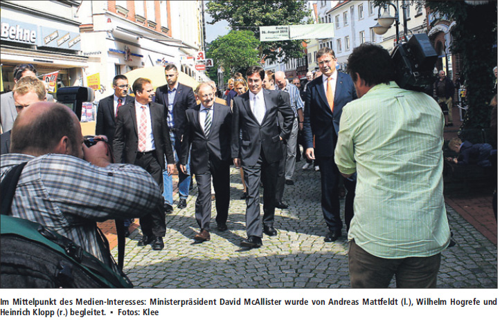 VERDEN. Land und Leute will David McAllister kennen lernen. So begründete der Ministerpräsident gestern bei seinem Besuch in Verden, dass er zwei Wochen lang durch Niedersachsen reist. Alle, die da vor dem Rathaus auf ihn warteten, schien der Gast allerdings schon zu kennen. Beim Landtagskollegen Wilhelm Hogrefe verwundert das nicht, auch nicht sehr beim CDU-Kreisvorsitzenden Adrian Mohr. Aber es ging so weiter: Hallo Herr Rosenthal, hallo Herr Klopp, hallo Herr Krippendorff…