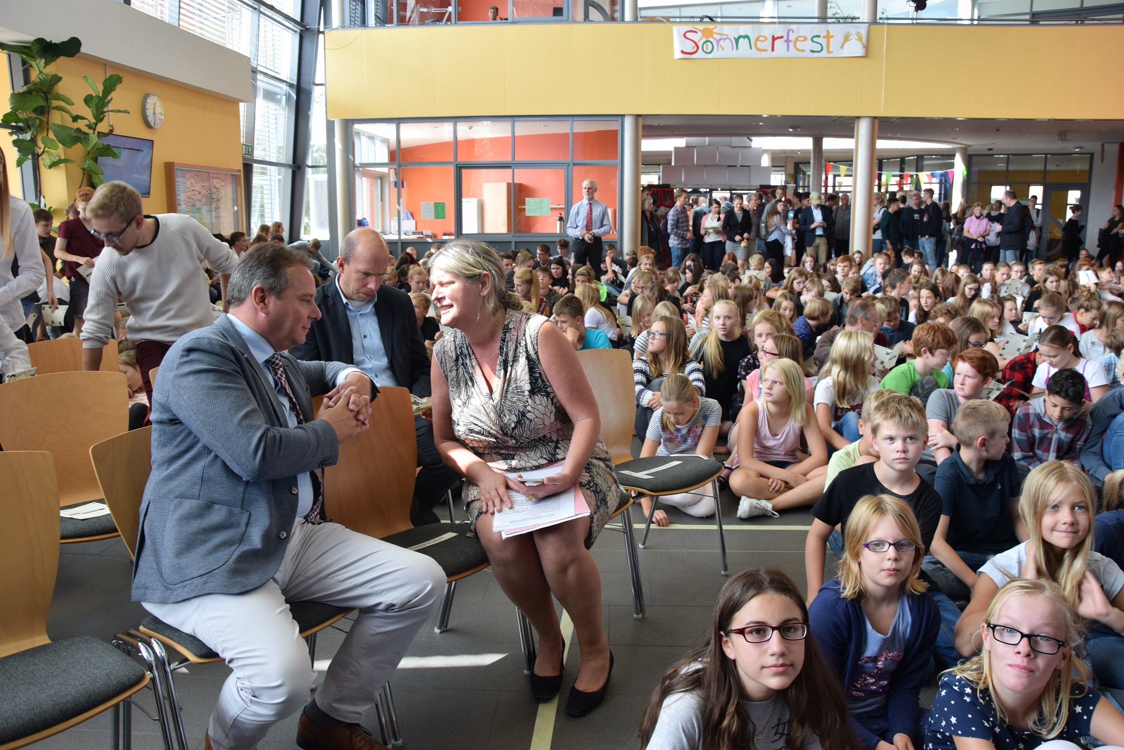 Als Höhepunkt des heutigen Projekttages, der maßgeblich von Schülern für Schüler gestaltet wurde und zahlreiche großartige Einzelprojekte beinhaltete, erhielt die gesamte Schule in einer besonderen Feierstunde aus den Händen der zuständigen Landeskoordinatorin des Kultusministeriums, Claudia Dierkes-Hartwig, das Zertifikat „Schule ohne Rassismus – Schule mit Courage“ überreicht.