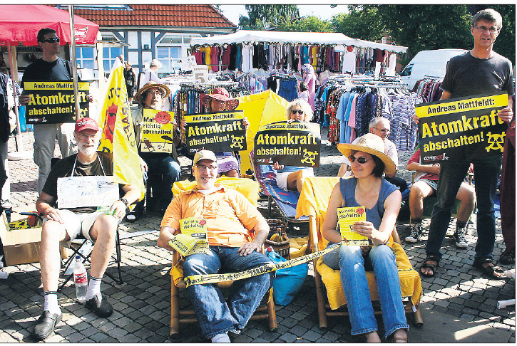 Nicht nur aus Achim und dem Kreis Verden, sondern auch aus dem Rotenburger Raum und Bremen kamen diese Damen und Herren mit Liegestühlen zum „Abschalten“ an den Stand der Grünen auf dem Achimer Wochenmarkt. Wie leicht zu erkennen, wurde bei dieser Protest-Vorstellung der im Verdener Ökozentrum mit ansässigen, bundesweit aktiven Gruppe „compact ¨ – Demokratie in Aktion“ aber vor allem das baldige Abschalten der Atomkraftwerke statt deren Laufzeitverlängerung gefordert. Sogar rund die Hälfte der CDU-Mitglieder sei laut Umfragen gegen die in der Bundesregierung diskutierte Verlängerung, machte Hartmut Kreye (Mitte vorn) aus Bremen deutlich. Daher werde auf den Plakaten auch der hiesige CDU-Bundestagsabgeordnete Andreas Mattfeldt direkt angesprochen. Der frühere Langwedeler Bürgermeister habe sich zur Laufzeitverlängerung nämlich nie klar geäußert. Längerfristige Weiternutzung des Atomstroms würde laut Kreye den Ausbau der Versorgung mit regenerativen Energien verhindern. Strom-Unternehmen hätten dann kaum noch Interesse, ihre Netze für Alternativstrom auszuweiten. Zudem finden es die Atomkraftgegner von „Compact“ empörend, dass sich die Atomstromproduzenten weigern, von ihren knapp sieben Milliarden Euro Jahresgewinn 2,3 Millionen Euro Brennelemente-Steuer abzuführen. Aktionen wie in Achim fanden in vielen weiteren Städten der Bundesrepublik statt. Foto: Laue